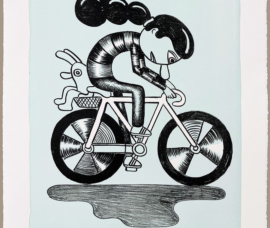 So here is “Cyclist, Rue du Montparnasse” from his “Streets of Jeremyville” Paris series.